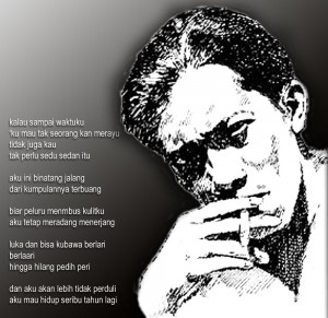 ‘Ku mau tak seorang kan merayu Tidak juga kau Tak perlu sedu sedan itu Aku ini binatang jalang Dari kumpulannya terbuang Biar peluru menembus kulitku Aku tetap meradang menerjang Luka dan bisa kubawa berlari Berlari Hingga hilang pedih peri Dan aku akan lebih tidak perduli Aku mau hidup seribu tahun lagi Maret 1943